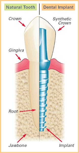 Your natural teeth are stable biting and chewing surfaces. They are supported by your jawbone. This will also be true of your dental implant. The crown is the tooth’s hard surface, which is visible above the gum line. The crowns of your natural teeth are held in place by roots. The root is the supportive base of your tooth and is fixed in your jawbone. In comparison, implants act like the roots of your natural teeth. Successful dental implants become firmly embedded in the jaw. The prosthetic crowns are held in place by implants providing a chewing surface almost as secure as your natural teeth.